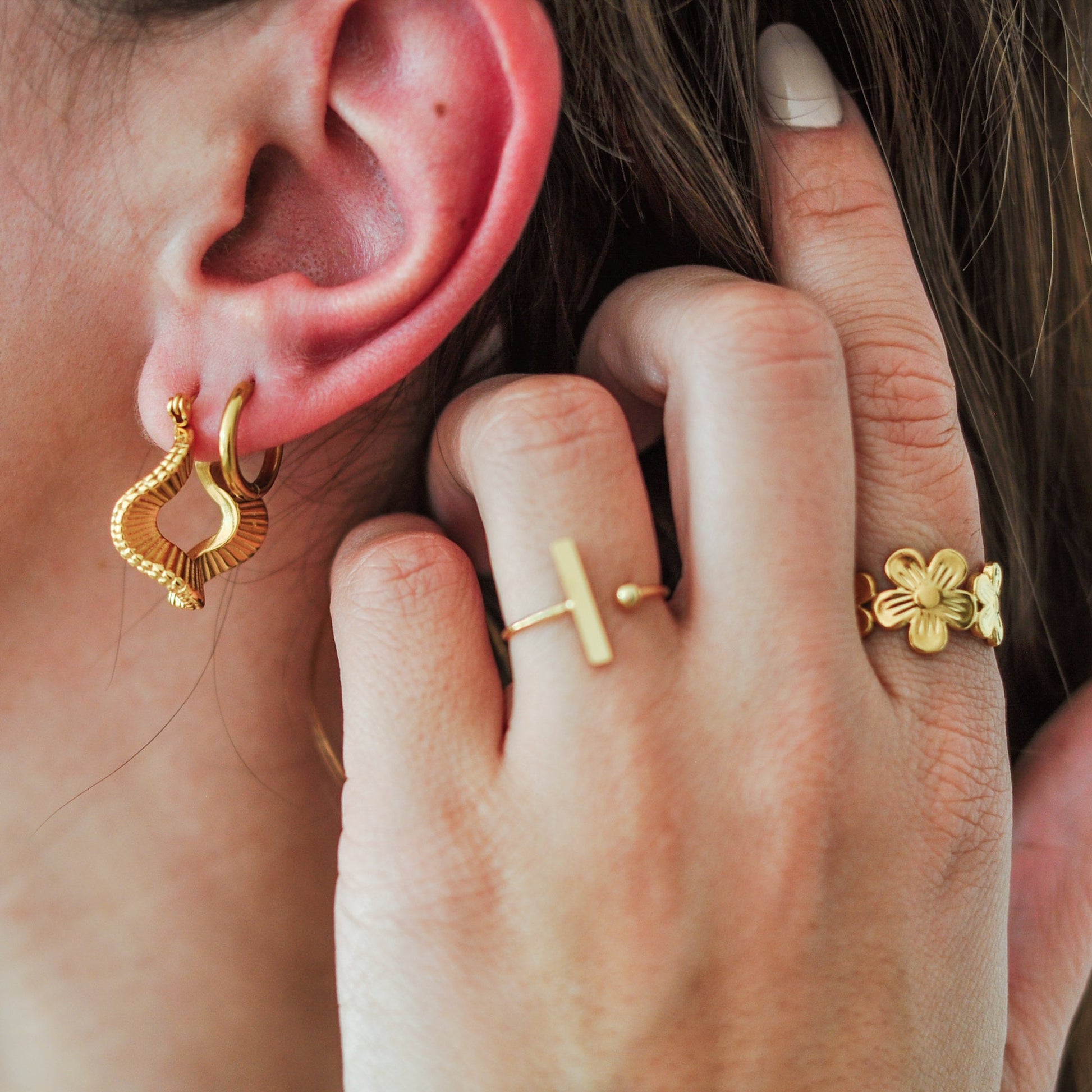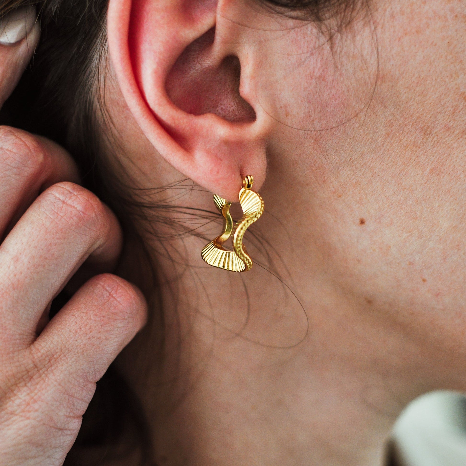 Brincos em forma de argola torcida, de aço inoxidável, banhado a ouro. Sofisticados, elegantes e intemporais. Vendidos ao par.