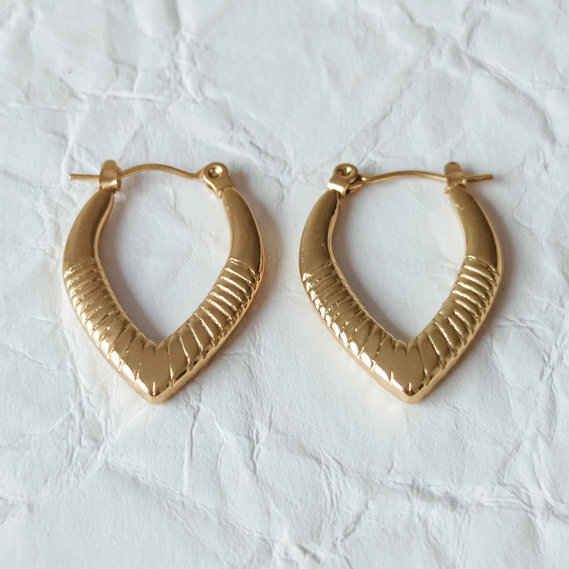 Brincos em forma de argola comprida trabalhada, de aço inoxidável, banhado a ouro. Elegantes e intemporais. Têm o encaixe da orelha muito fino, ficando confortáveis em todos os futos. Vendidos ao par.