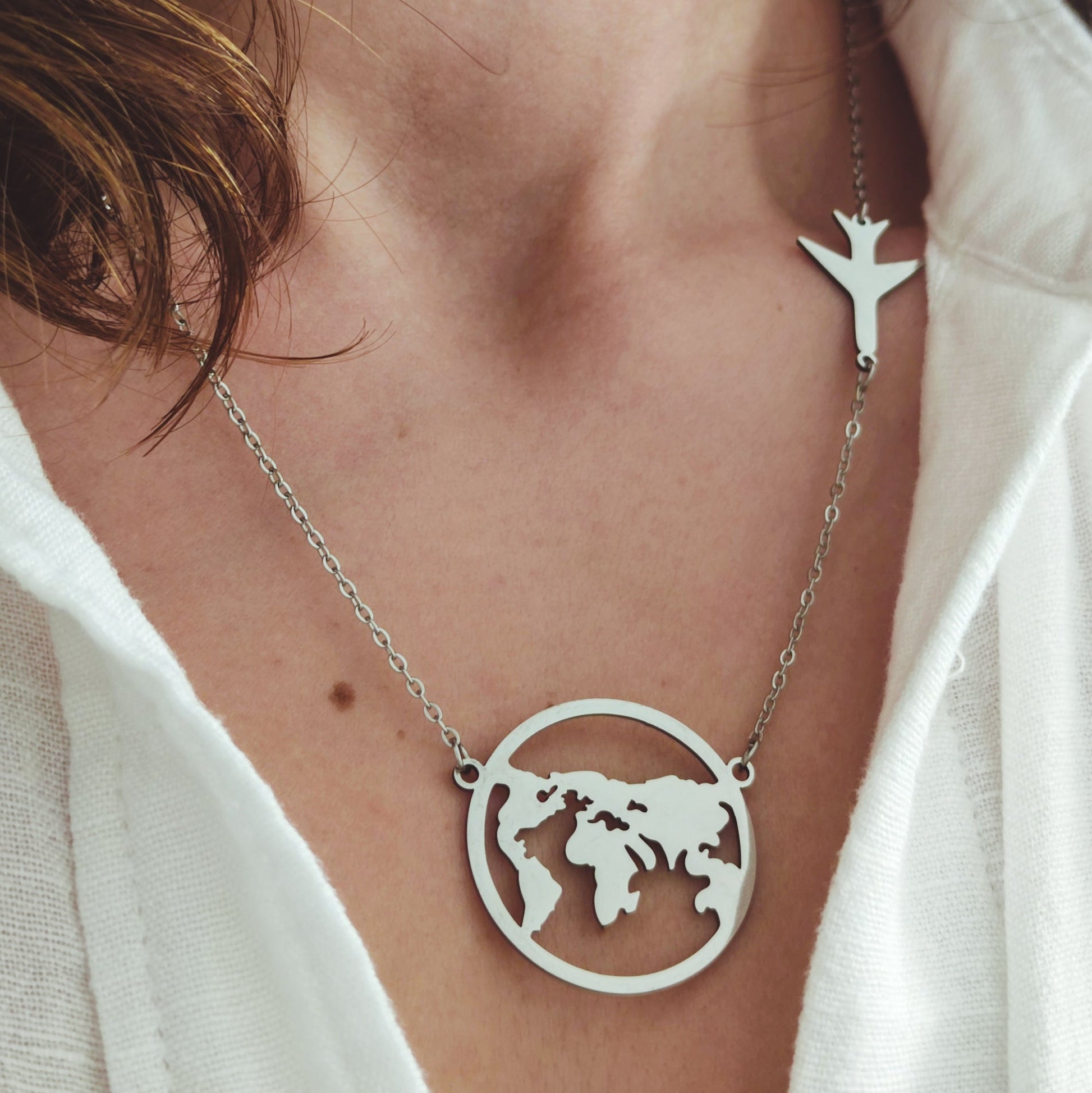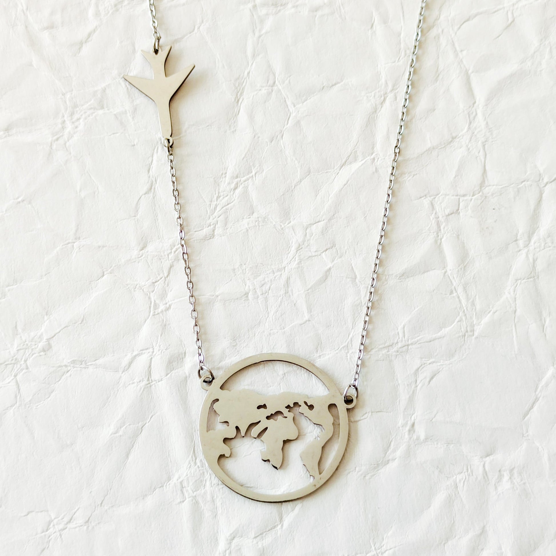 Colar de aço inoxidável prateado. Design de globo terrestre centrado com um avião ao lado. Este colar é especialmente apreciado por amantes de viagens e cidadãos do mundo, captando o espírito de aventura e os descobrimentos. É maior do que os colares equivalentes encontrados no mercado, garantindo-se como uma peça central em qualquer visual. Adiciona um toque de  paixão pela descoberta ao teu estilo com este colar marcante.