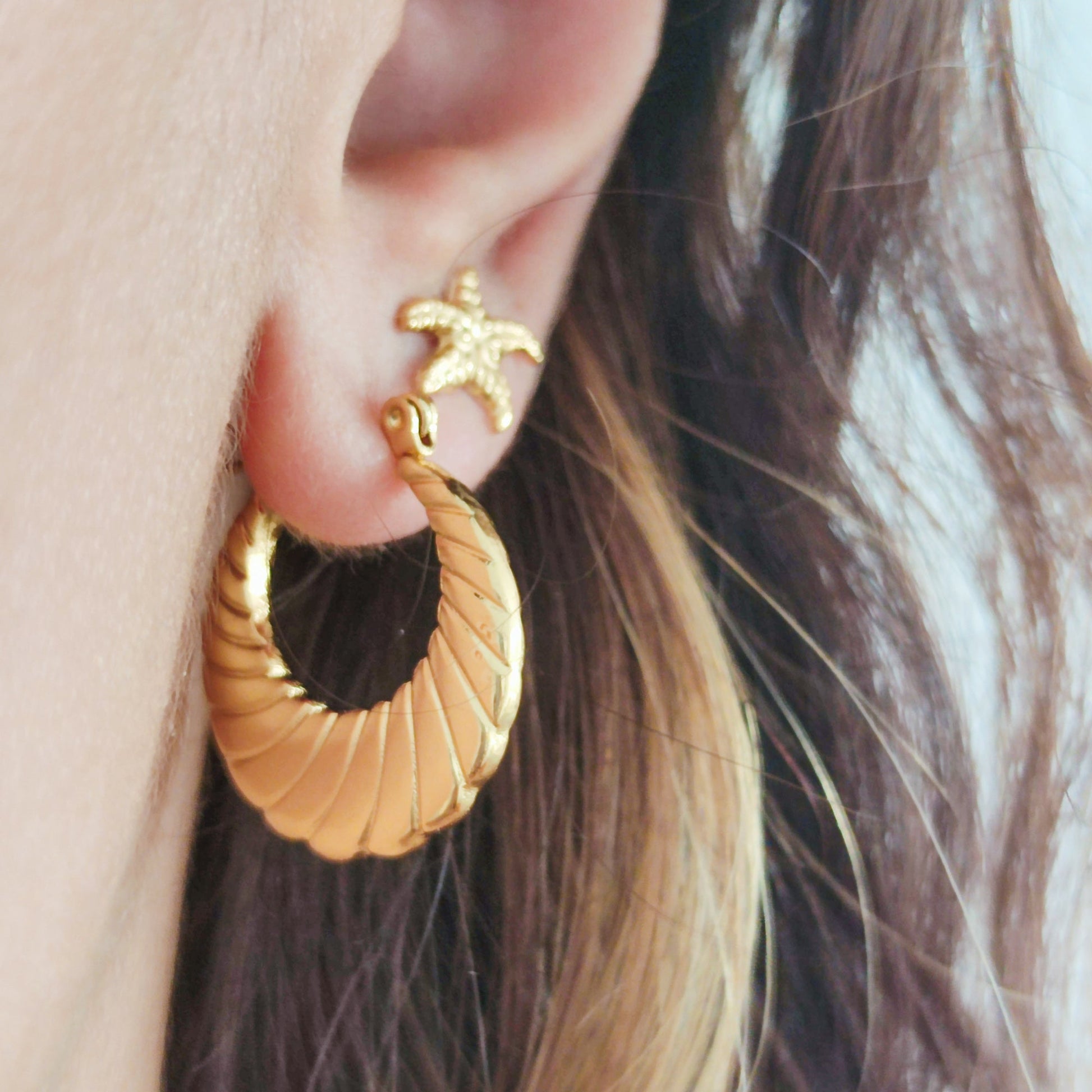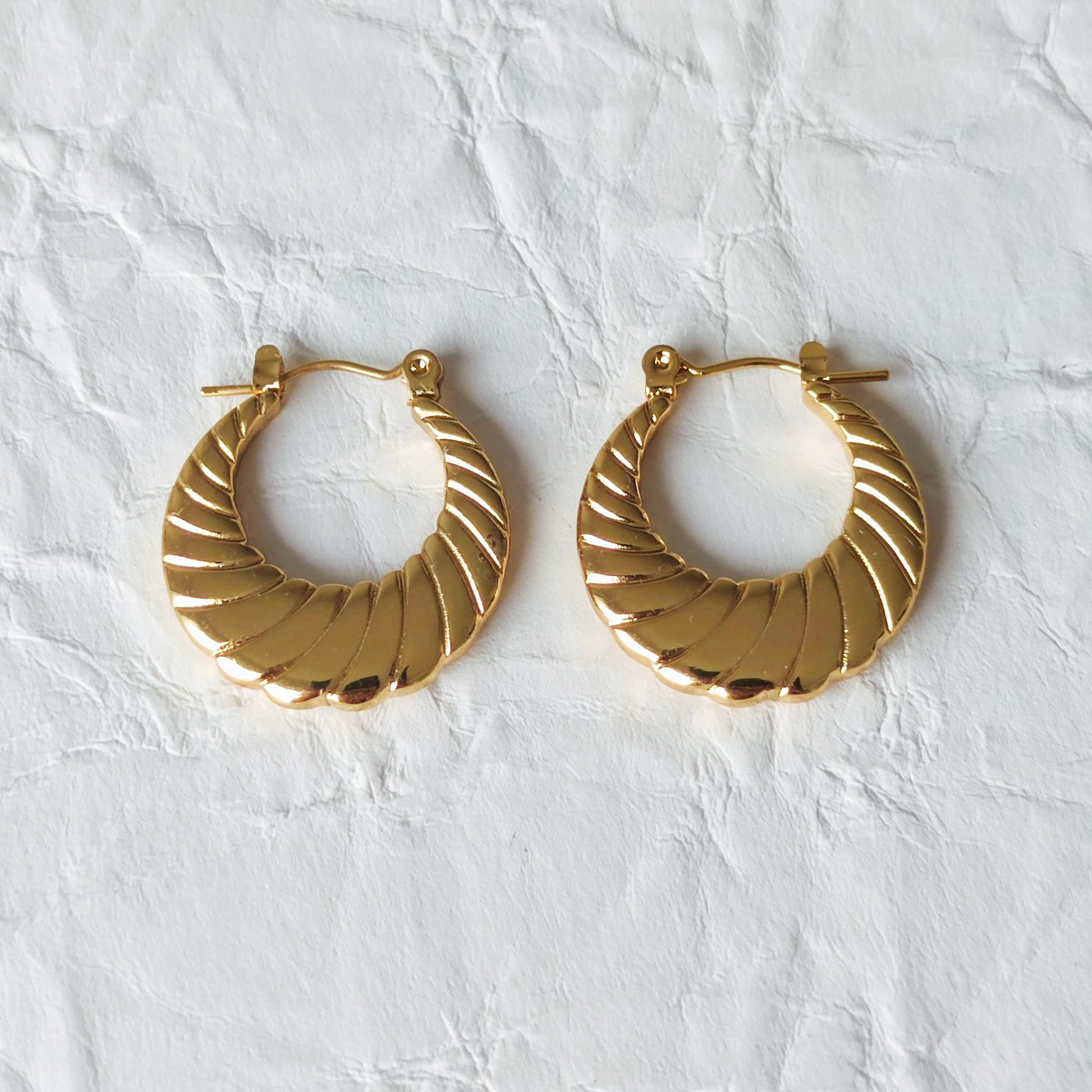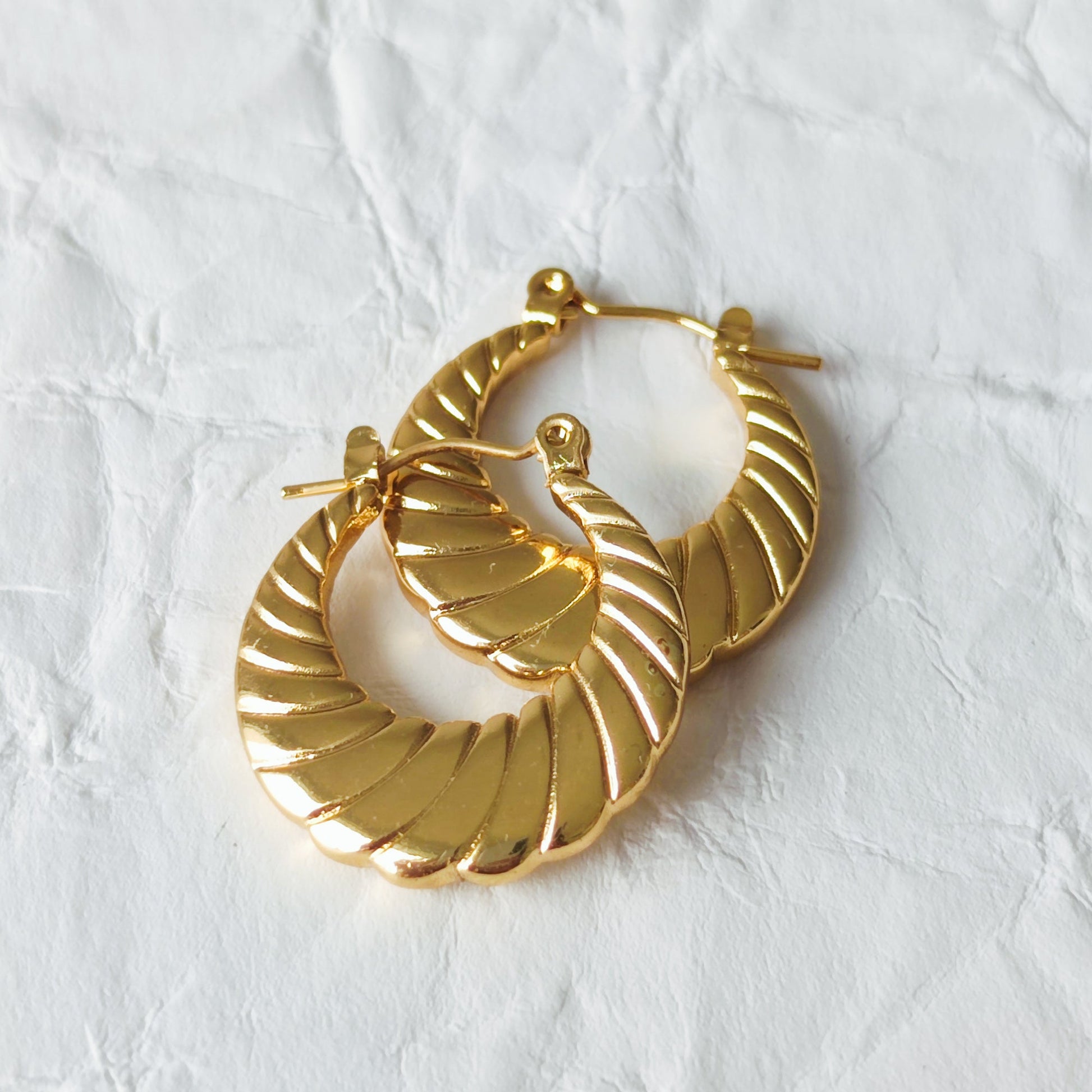 Brincos em forma de argola trabalhada, de aço inoxidável, banhado a ouro. Elegantes e intemporais. Têm o encaixe da orelha muito fino, ficando confortáveis em todos os futos. Vendidos ao par.