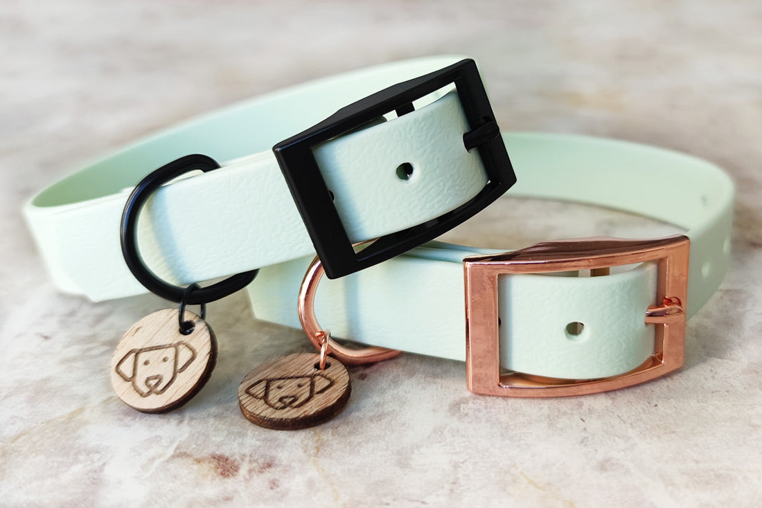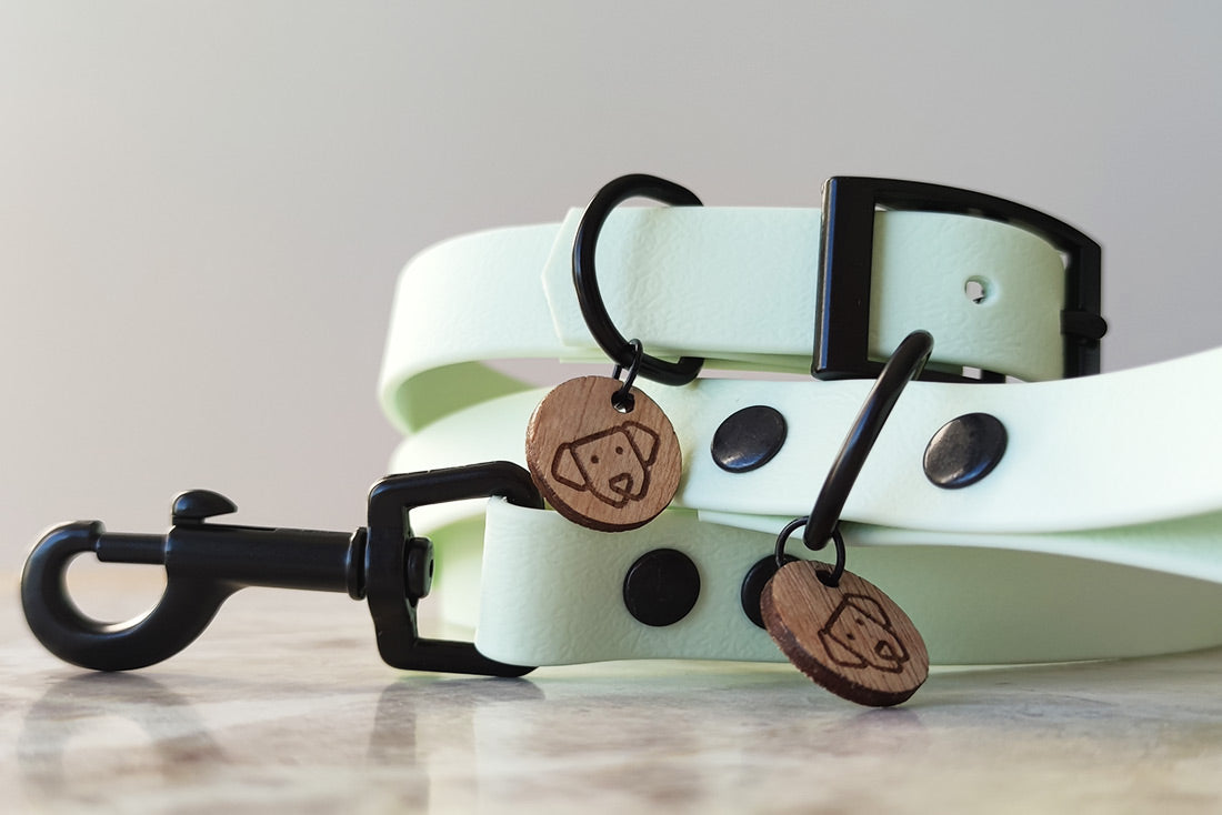 Coleira artesanal premium em pele vegan, com acabamentos de luxo. Resistente a todas as aventuras, mas muito suave ao toque.