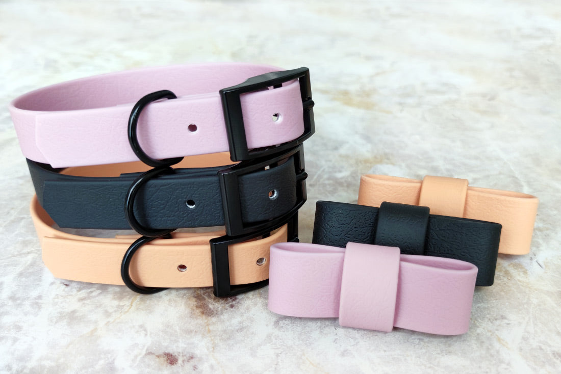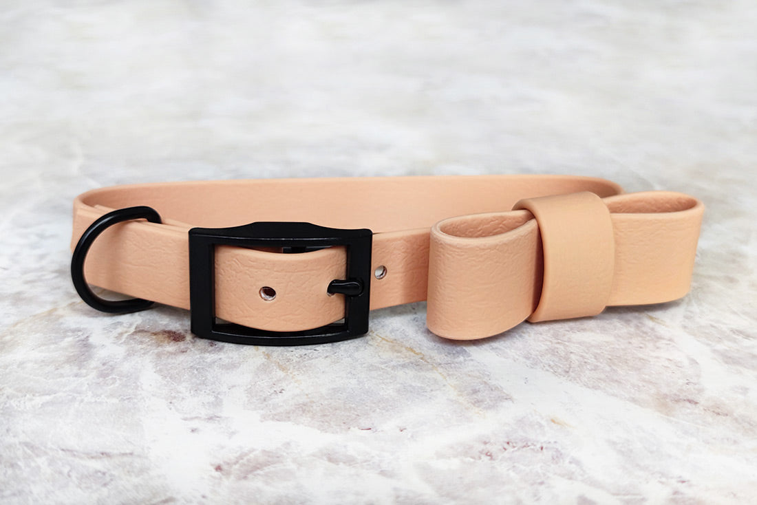 Coleira artesanal premium em pele vegan, com acabamentos de luxo. Opção de laço removível. Resistente a todas as aventuras, mas muito suave ao toque.